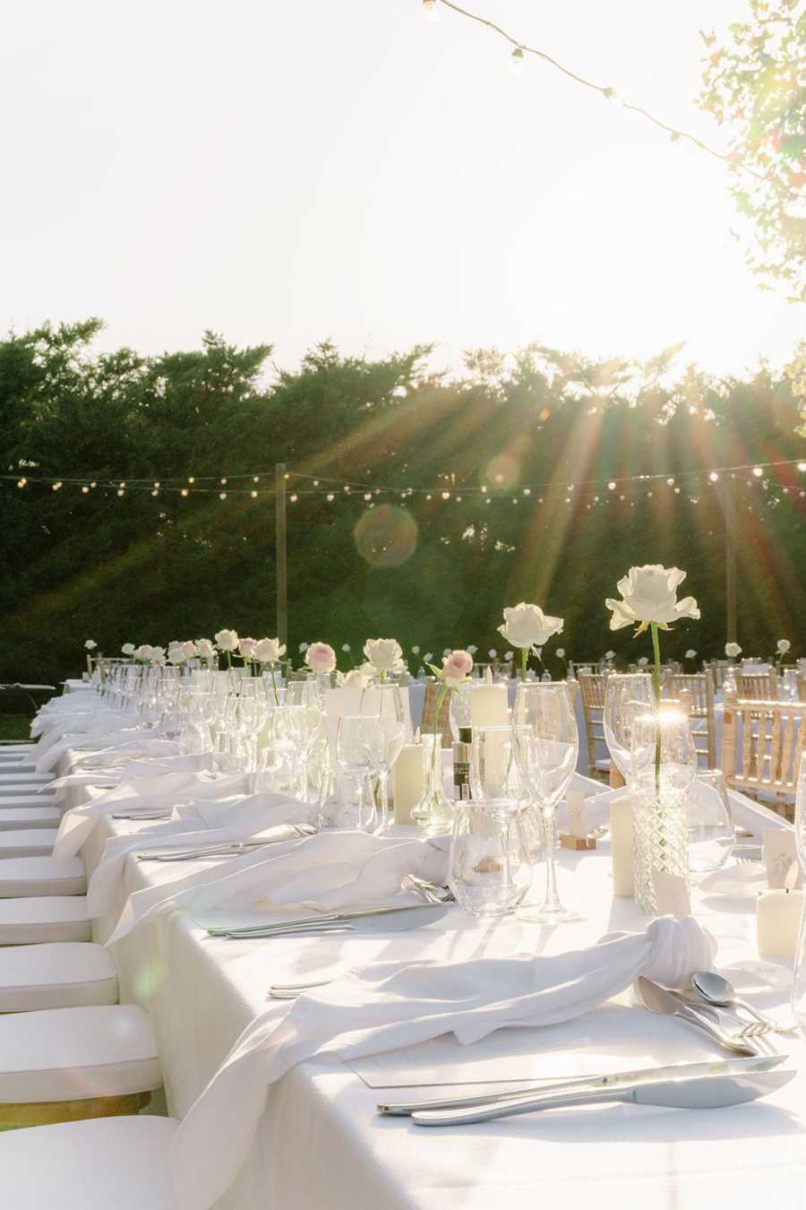 Nikahın ardından davetliler, hemen yan tarafta yer alan, restoran bahçesinin ana yemek alanına geçti. Burası, soft ve beyaz tonlardaki masalar ve tepeden sarkan aydınlatmaların birleşimiyle şahane ve samimi bir ziyafet alanına dönüştürüldü.