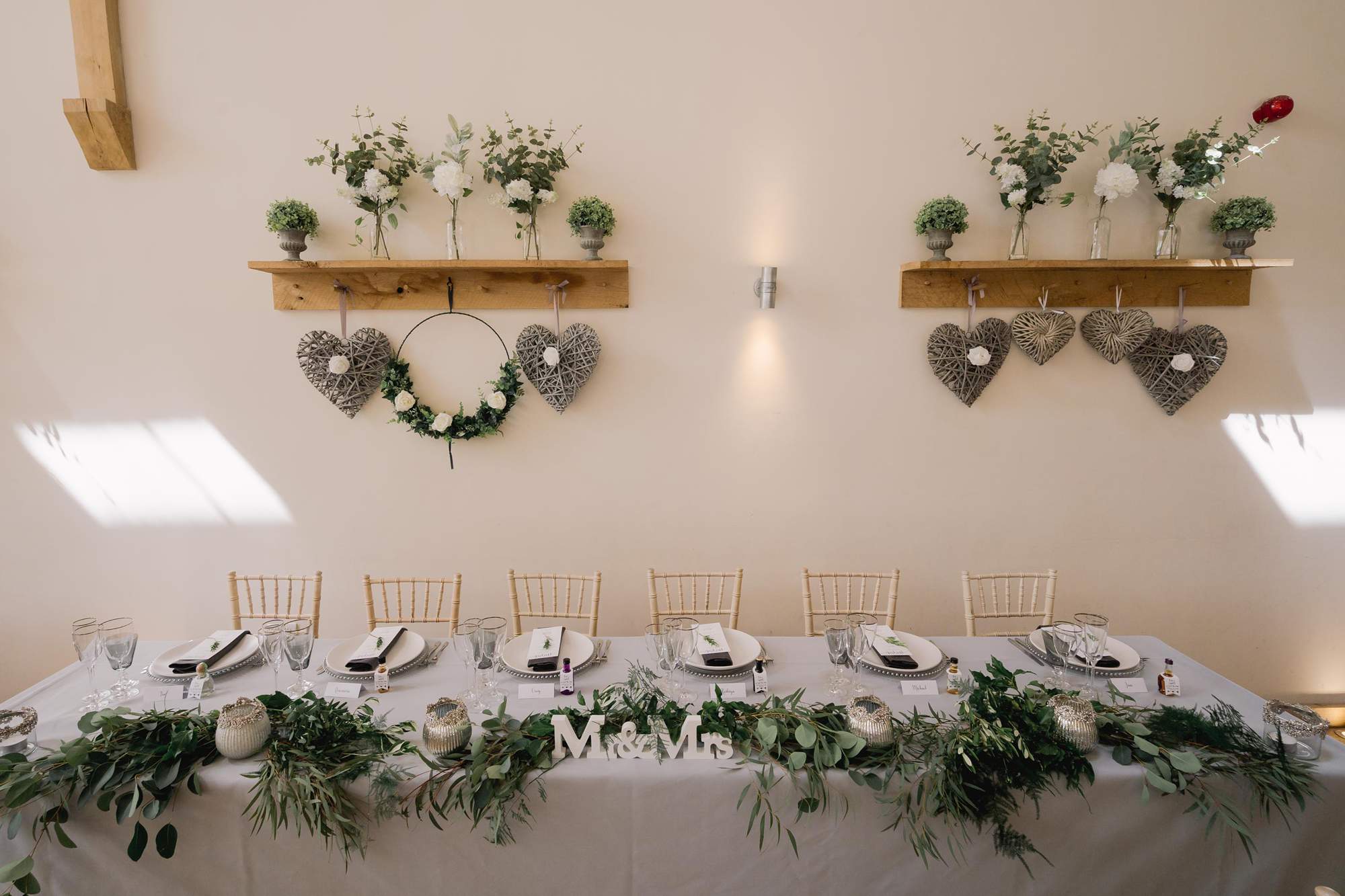 Üzerine sadece katlanmış pamuklu keten peçeteler, ince uzun cam mumluklar ve bolca zeytin dalı ile kuru ot düzenlemeleri yerleştirildi. Bu minimalist yaklaşım, sade bir şıklık yaratırken, misafirlerin masadaki en önemli şey olan sohbetlerine odaklanmasını sağladı.