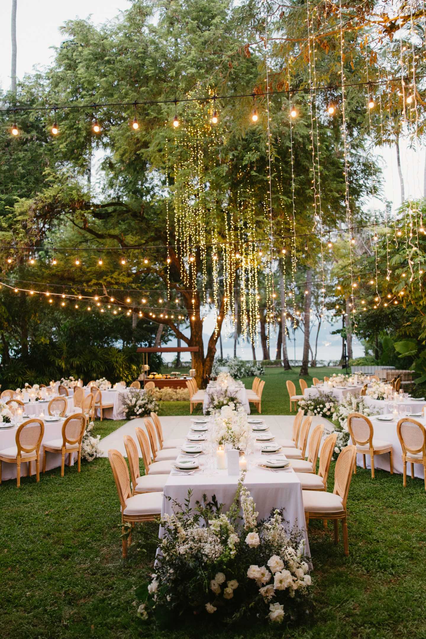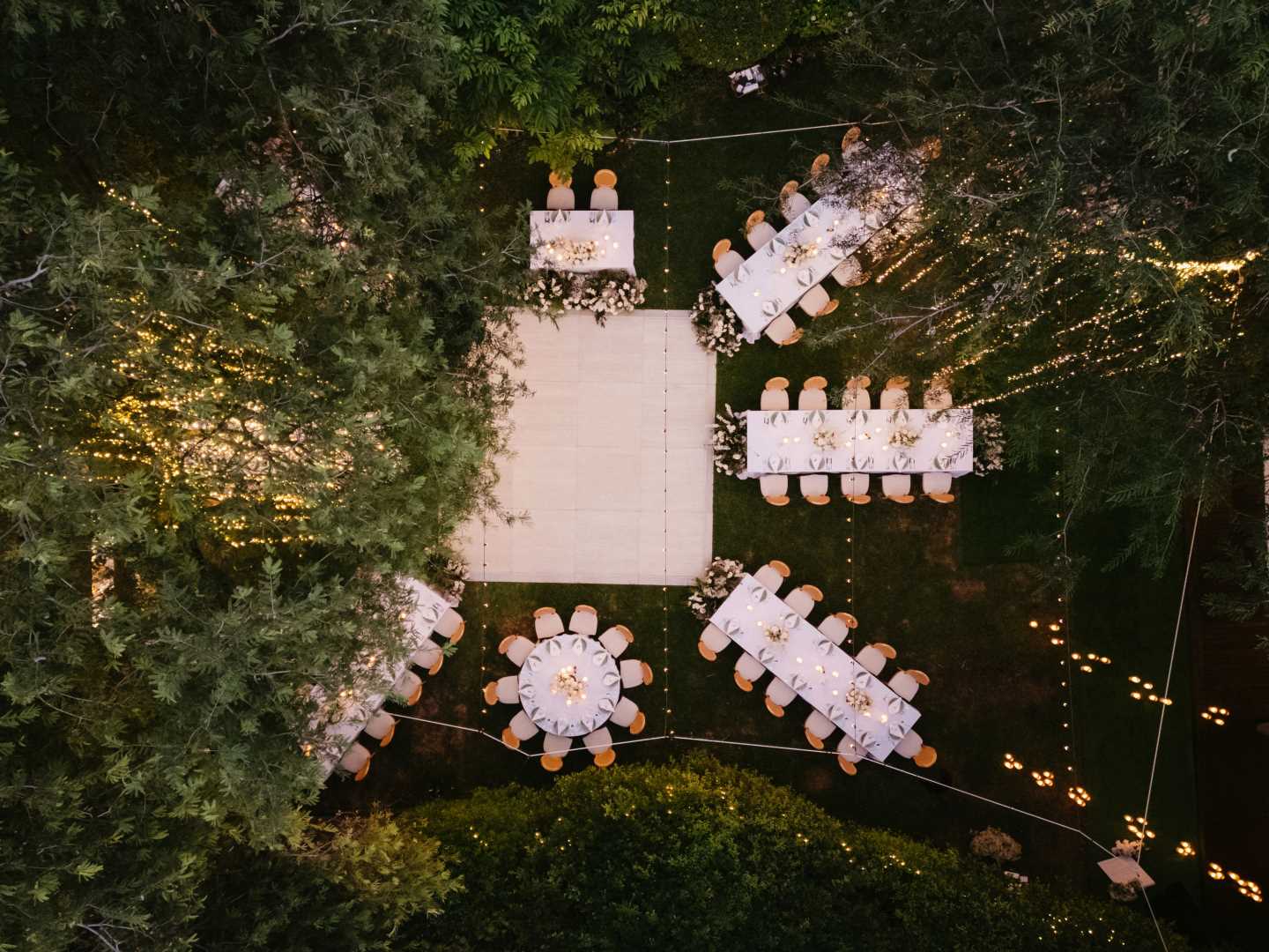 Gecenin en dikkat çekici detayı ve atmosferin sihirli anahtarı, palmiye ağaçları arasına ördüğümüz ışık mimarisiydi. Ağaçların geniş dalları arasına, binlerce metre uzunluğunda sıcak sarı tonlu peri led (fairy lights) ışıklar titizlikle asıldı. Bu ışıklar, havada asılı duran sihirli, parıldayan bir tavan yarattı. Masaların üzerindeki bu ışıktan gökyüzü, masallardaki bir kır davetinin en şık ve sofistike halini temsil ediyordu.