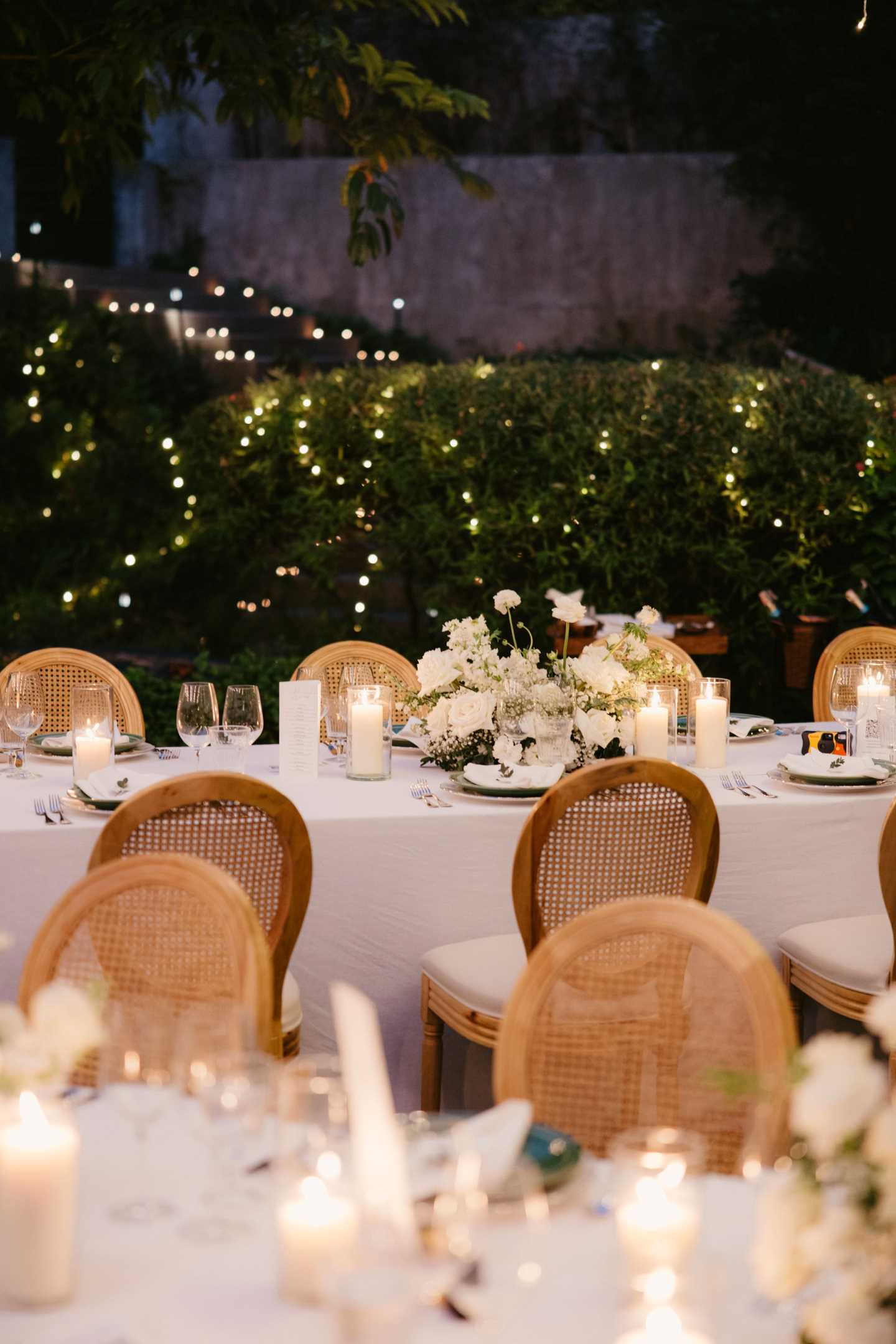 Seremoni sonrası davetliler, düğün zarafetinin en göz alıcı bölümü olan akşam yemeği resepsiyonuna davet edildi. Bu alan, pudra tonlarının ve mum detaylarının yarattığı büyülü bir atmosfere sahipti.