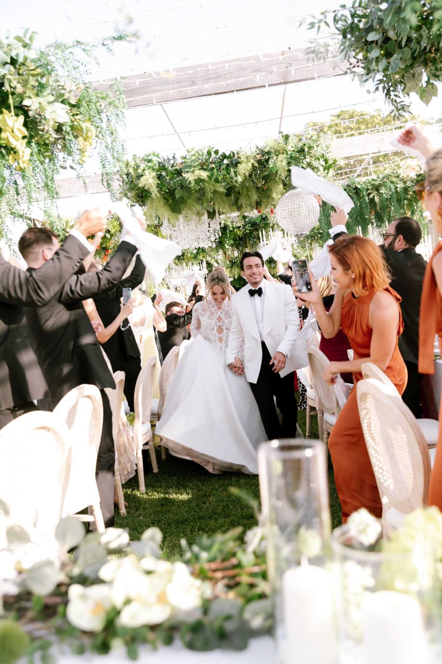 Seremoni alanı, beyazın saf zarafeti ile kurgulandı. Ağaçlar arasına kurulan sade, doğal ahşap bir kemer, yoğun beyaz çiçek süslemeleri ve nar çiçeği renginde narin aksanlarla bezendi. 100 misafirin oturduğu şeffaf (ghost) sandalyeler, doğanın manzarayı kesmesini engelledi. La Vita Wedding ekibi, seremoninin teknik ve duygusal akışını, çiftin yeminlerine odaklanılmasını sağlayacak şekilde, kusursuz ve görünmez bir şekilde yönetti.