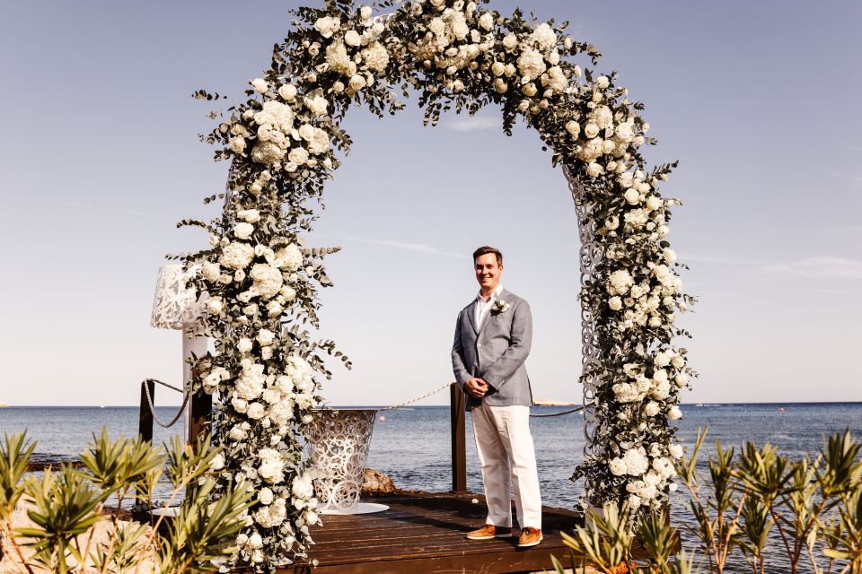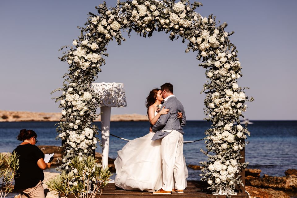Nikah Seremonisi: Kumsal üzerine kurulan, yükseltilmiş ahşap podyumda gerçekleşen seramoni, beyaz gül yaprakları ve deniz kabuklarıyla çevrelendi.
